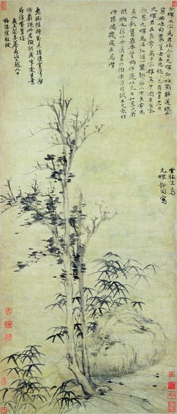南京博物院藏《古木丛篁图》,水墨清华,平坡上大石一堵,枯树矗立,两旁幽篁细竹相衬。淡墨写枯树,干挺枝疏,无故意的交错与盘曲,转折主次,左揖右让,丝丝分明,上攒若干扁圆点子,或疏或密,在有意无意之间,十分率意,呈现出岁寒荒率之意境。竹子纯以中锋湿笔点画,细枝阔叶,浓淡相间,挺劲洒脱,在空寂萧瑟的气氛中增添了一份活跃。拳石用干笔侧锋飞白勾皴,浓墨点醒,层次向背分明,坡陀呈地道的折带皴,疏而不简,颇具质感。一切皆出以简笔疏朗,自有一种空阔高旷的境界。整幅画面,虚灵生动,气韵高清,可以说是倪瓒作品中难得的精品之一。
